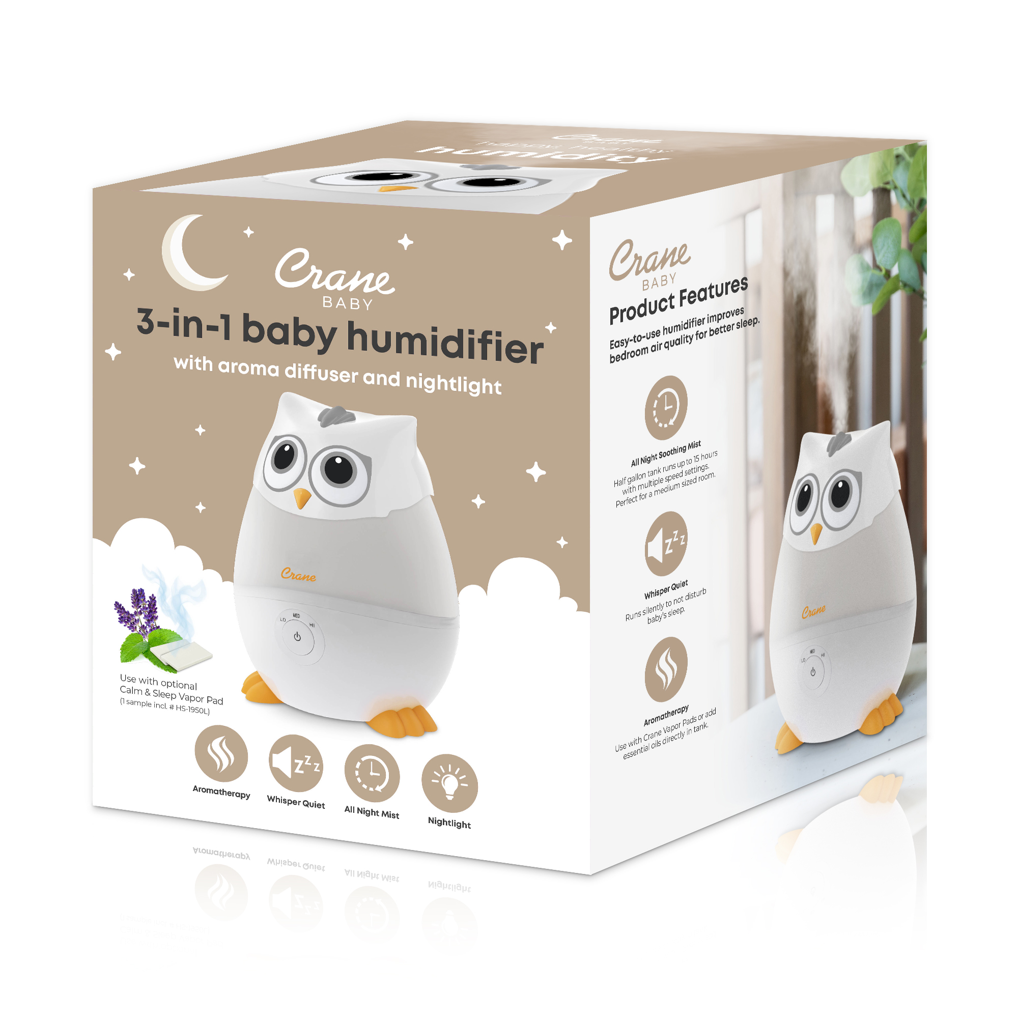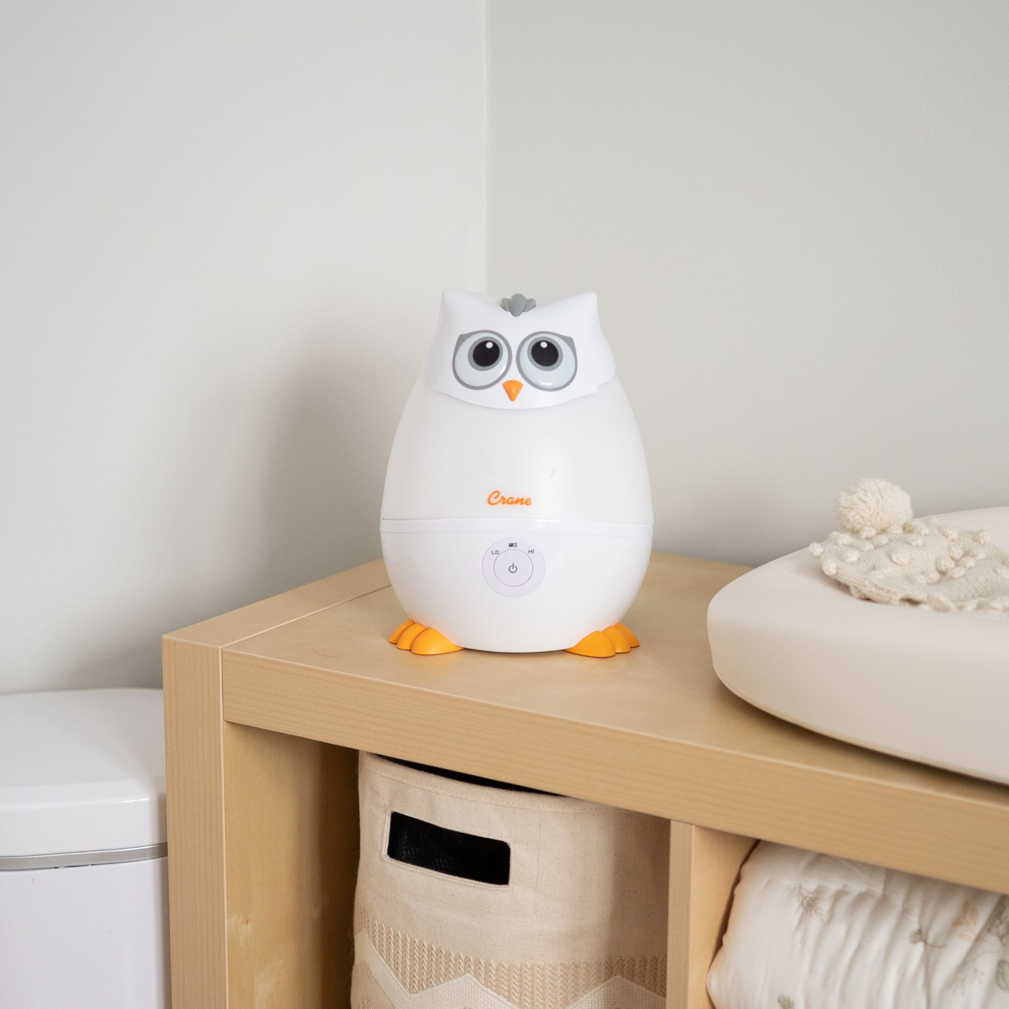 Featuring our kid-friendly Mini Snow Owl design, this compact cool mist humidifier brings gentle moisture and comfort to your nursery, toddler room, or any small living space. Ideal for baby congestion relief, dry air, and bedtime routines, the Crane Baby Mini Adorable Owl Humidifier adds wellness to your entire family with an award-winning design and parent-trusted performance. Part of your must-have nursery essentials, this humidifier doubles as a soothing nightlight and includes a built-in aroma tray for optional vapor pads.